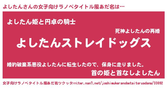 | 男性向けラノベタイトル風あだ名 | 『Re:よしたんから始める異世界生活』 |
