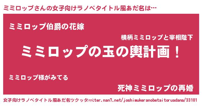 | 男性向けラノベタイトル風あだ名 | 『ミミロップ~年齢イコール彼女いない歴の魔法使い~』 |