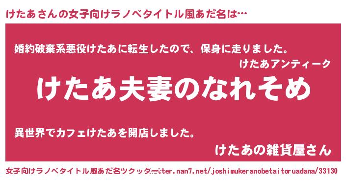 | 男性向けラノベタイトル風あだ名 | 『おまえをオタクにしてやるから、俺をけたあにしてくれ! 』 |