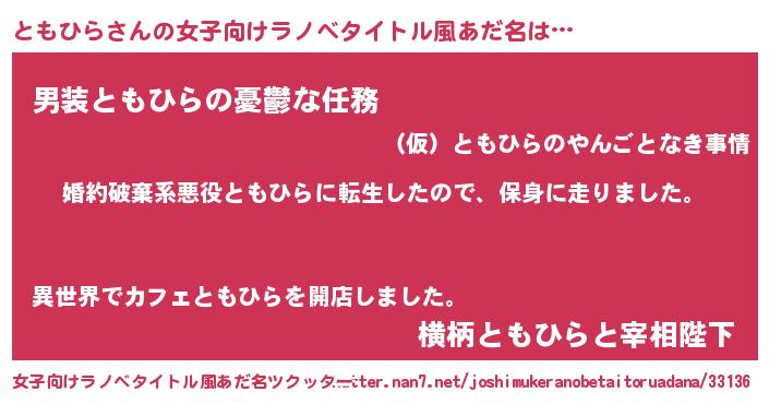 | 男性向けラノベタイトル風あだ名 | 『トモヒラスレイヤー』『ともひらの憂鬱』 |