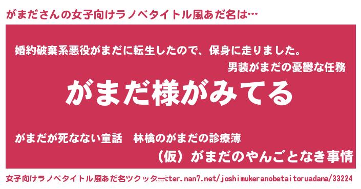 | 男性向けラノベタイトル風あだ名 | 『がまだの嫁は女の子じゃないと思った?』 |