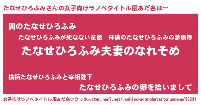 | 男性向けラノベタイトル風あだ名 | 『おまえをオタクにしてやるから、俺をたなせひろふみにしてくれ! 』 |