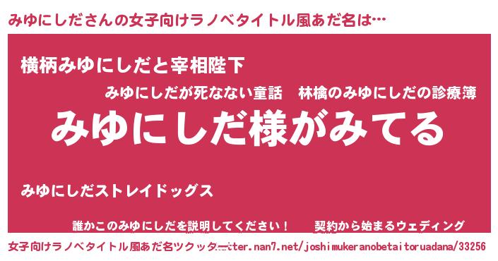 | 男性向けラノベタイトル風あだ名 | 『みゆにしだの嫁は女の子じゃないと思った?』 |