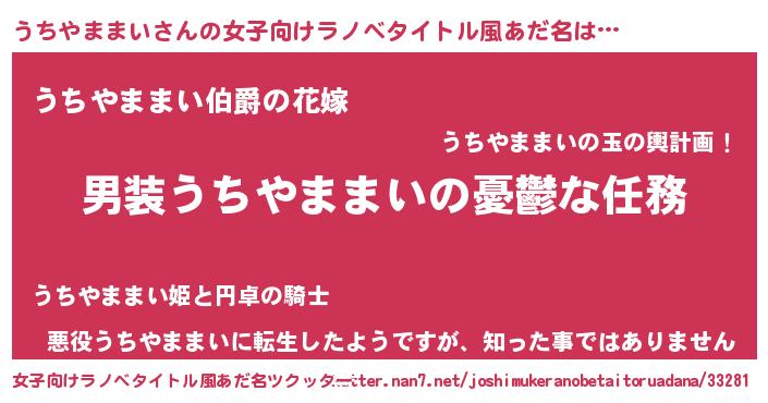 | 男性向けラノベタイトル風あだ名 | 『うちのうちやままいが世界を掌握している!』 |