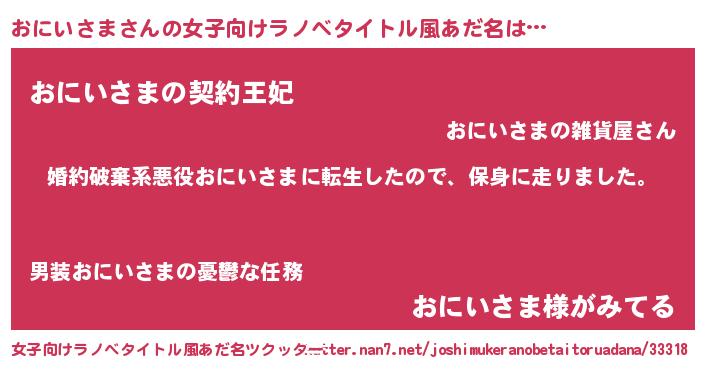 | 男性向けラノベタイトル風あだ名 | 『転生したらおにいさまだった件』 |