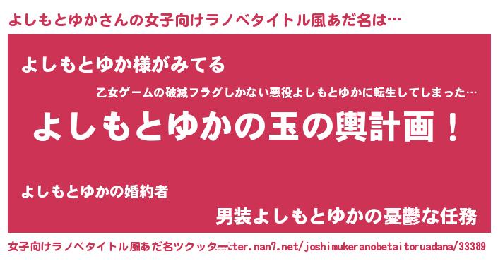 | 男性向けラノベタイトル風あだ名 | 『よしもとゆか~年齢イコール彼女いない歴の魔法使い~』 |
