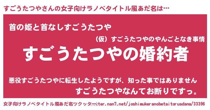 すごうたつやさんの女子向けラノベタイトル風あだ名は… 『すごうたつやの婚約者』『首の姫と首なしすごうたつや』『すごうたつやなんてお断りですっ。』 ツクッター #女子向けラノベタイトル風あだ名ツクッター http://tkutter.nan7.net/joshimukeranobetaitoruadana/33396/