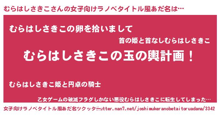 | 男性向けラノベタイトル風あだ名 | 『むらはしさきこ~年齢イコール彼女いない歴の魔法使い~』 |