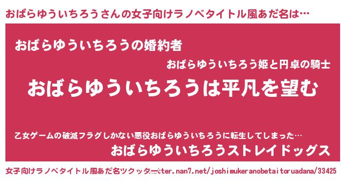 | 胡散臭い通販商品みたいなあだ名 | 『信頼と実績のサプリメント…その名も「おばらゆういちろう」』 |