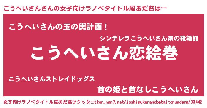 | 男性向けラノベタイトル風あだ名 | 『おまえをオタクにしてやるから、俺をこうへいさんにしてくれ! 』 |
