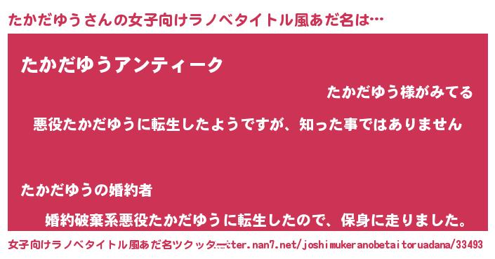 | 男性向けラノベタイトル風あだ名 | 『この素晴らしい世界にたかだゆうを!』 |