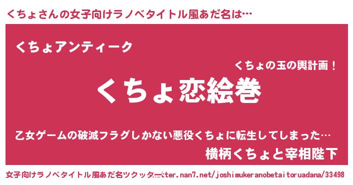 | 男性向けラノベタイトル風あだ名 | 『おまえをオタクにしてやるから、俺をくちょにしてくれ! 』 |