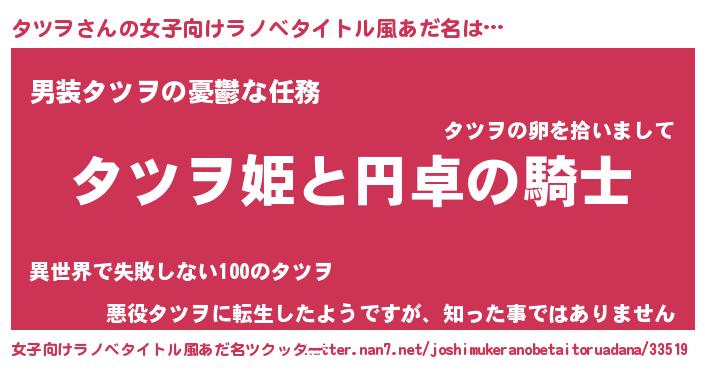 | 男性向けラノベタイトル風あだ名 | 『タツヲアートオンライン』 |