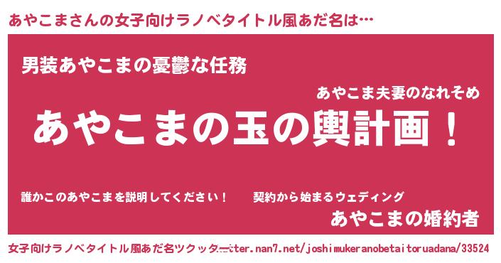| 男性向けラノベタイトル風あだ名 | 『あやこま~年齢イコール彼女いない歴の魔法使い~』 |