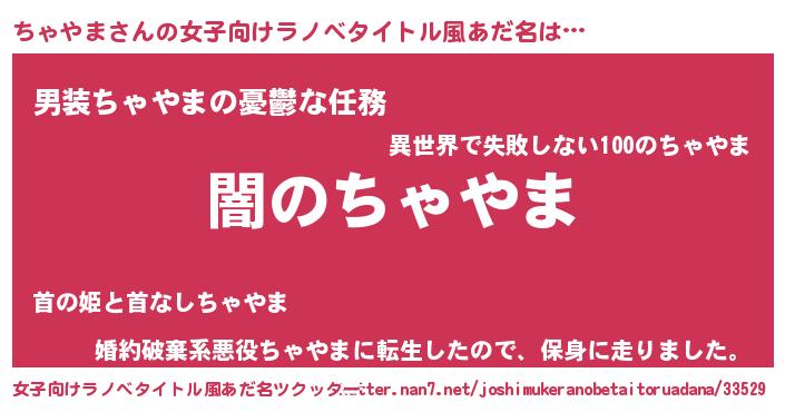 | 男性向けラノベタイトル風あだ名 | 『Re:ちゃやまから始める異世界生活』 |