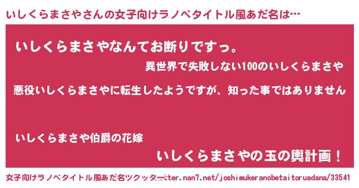 | 男性向けラノベタイトル風あだ名 | 『この素晴らしい世界にいしくらまさやを!』 |