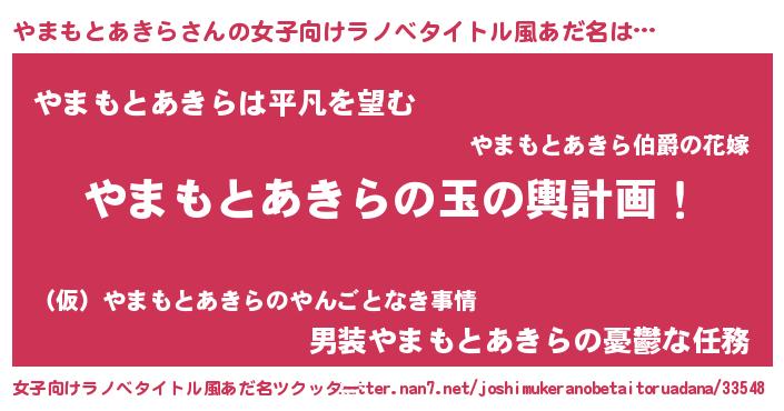 | 男性向けラノベタイトル風あだ名 | 『やまもとあきら~年齢イコール彼女いない歴の魔法使い~』 |