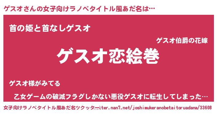 | 男性向けラノベタイトル風あだ名 | 『おまえをオタクにしてやるから、俺をゲスオにしてくれ! 』 |