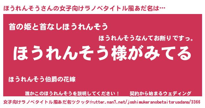 | 男性向けラノベタイトル風あだ名 | 『ほうれんそうの嫁は女の子じゃないと思った?』 |