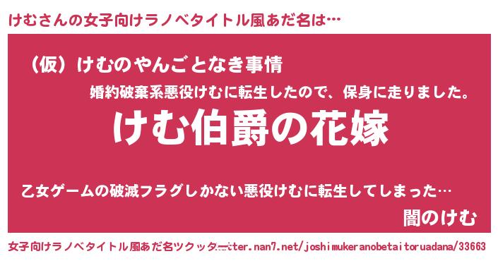| 男性向けラノベタイトル風あだ名 | 『うちの娘の為ならば、俺はもしかしたらけむも倒せるかもしれない。』 |