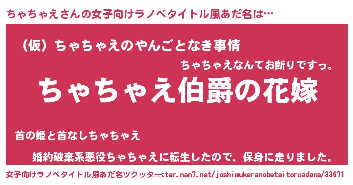 | 男性向けラノベタイトル風あだ名 | 『やはりちゃちゃえの青春ラブコメはまちがっている 』 |