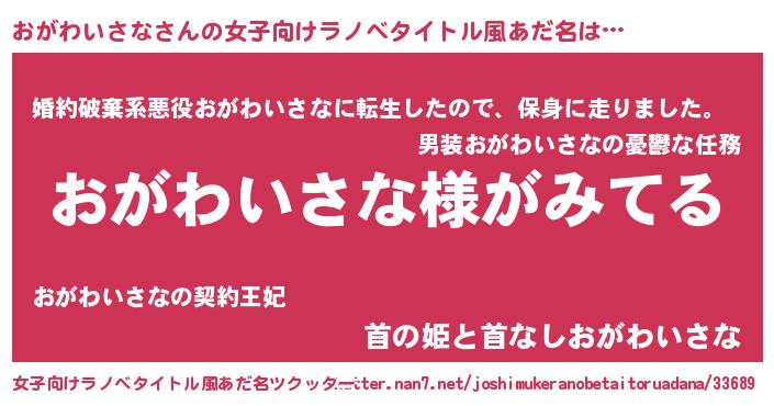 | 男性向けラノベタイトル風あだ名 | 『おがわいさなの嫁は女の子じゃないと思った?』 |
