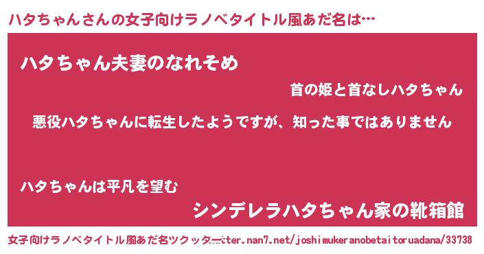 | 胡散臭い通販商品みたいなあだ名 | 『あなたにだけ特別に提供する世界で10本だけ現存している希少なブランデー…その名も「ハタちゃん」』 |