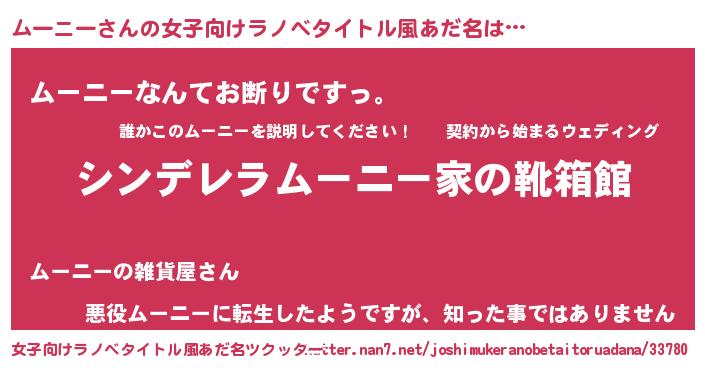 ムーニーさんの女子向けラノベタイトル風あだ名は… 『シンデレラムーニー家の靴箱館』『ムーニーなんてお断りですっ。』『悪役ムーニーに転生したようですが、知った事ではありません』 ツクッター #女子向けラノベタイトル風あだ名ツクッター http://tkutter.nan7.net/joshimukeranobetaitoruadana/33780/