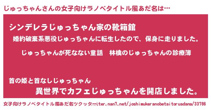 | 胡散臭い通販商品みたいなあだ名 | 『ハリウッド女優が絶賛した100年もののヴィンテージワイン…その名も「じゅっちゃん」』 |
