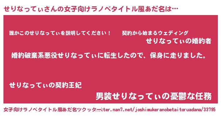| 男性向けラノベタイトル風あだ名 | 『転生したらせりなってぃだった件』 |