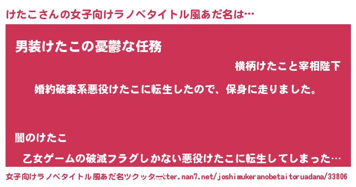 | 男性向けラノベタイトル風あだ名 | 『転生したらけたこだった件』 |