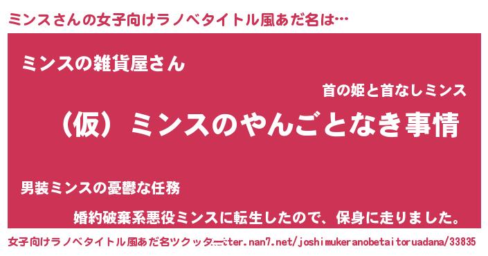 | 男性向けラノベタイトル風あだ名 | 『ミンスの憂鬱』『ミンススレイヤー』 |