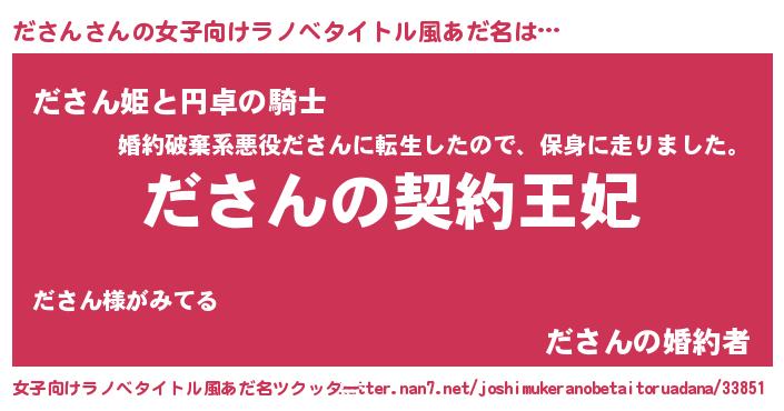 | 男性向けラノベタイトル風あだ名 | 『ださんという概念が存在しない退屈な世界 』 |