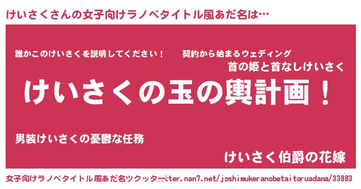 | 男性向けラノベタイトル風あだ名 | 『けいさく~年齢イコール彼女いない歴の魔法使い~』 |