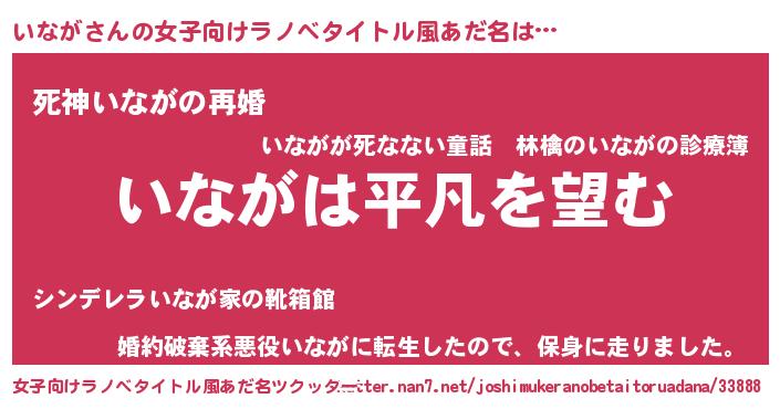 | 胡散臭い通販商品みたいなあだ名 | 『信頼と実績のサプリメント…その名も「いなが」』 |
