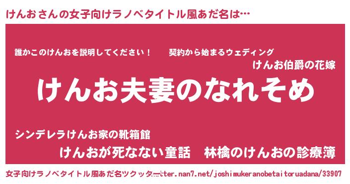 | 男性向けラノベタイトル風あだ名 | 『おまえをオタクにしてやるから、俺をけんおにしてくれ! 』 |