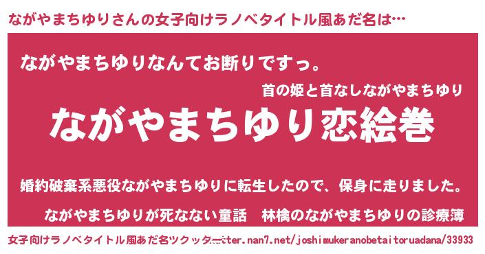 | 男性向けラノベタイトル風あだ名 | 『おまえをオタクにしてやるから、俺をながやまちゆりにしてくれ! 』 |