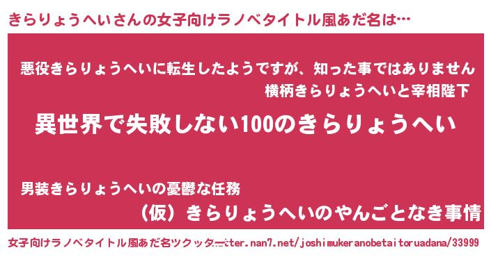 | 男性向けラノベタイトル風あだ名 | 『きらりょうへいという概念が存在しない退屈な世界 』 |