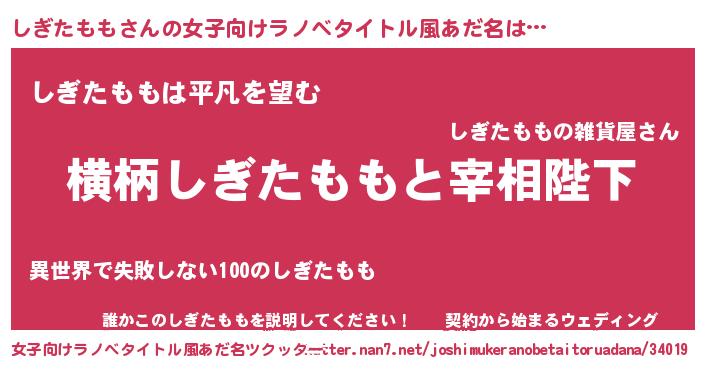 | 男性向けラノベタイトル風あだ名 | 『しぎたももに滅ぼされるだけの簡単なお仕事です』 |