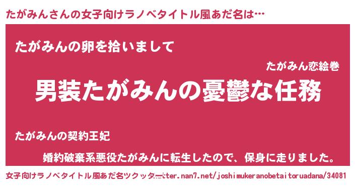 | 男性向けラノベタイトル風あだ名 | 『うちのたがみんが世界を掌握している!』 |
