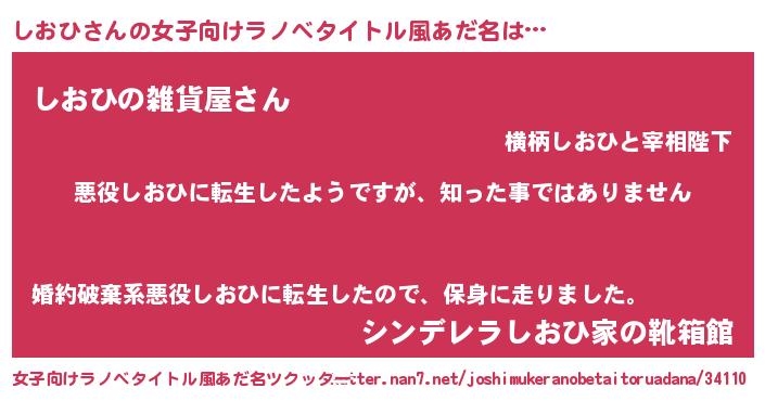 | 男性向けラノベタイトル風あだ名 | 『この素晴らしい世界にしおひを!』 |