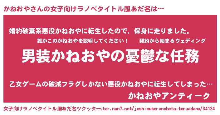 | 男性向けラノベタイトル風あだ名 | 『うちのかねおやが世界を掌握している!』 |