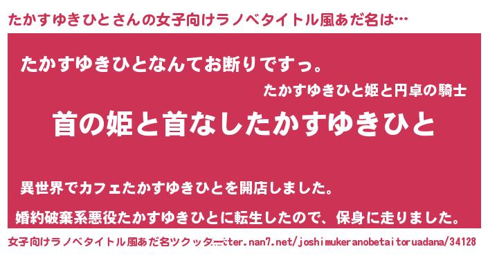 たかすゆきひとさんの女子向けラノベタイトル風あだ名は… 『首の姫と首なしたかすゆきひと』『たかすゆきひとなんてお断りですっ。』『婚約破棄系悪役たかすゆきひとに転生したので、保身に走りました。』 ツクッター #女子向けラノベタイトル風あだ名ツクッター http://tkutter.nan7.net/joshimukeranobetaitoruadana/34128/