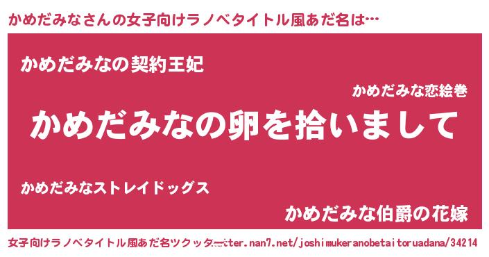 | 男性向けラノベタイトル風あだ名 | 『かめだみなの嫁は女の子じゃないと思った?』 |