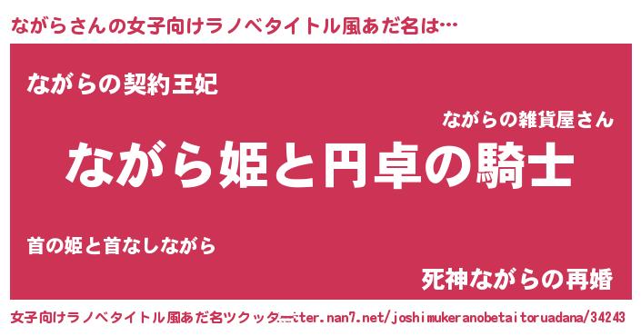 | 男性向けラノベタイトル風あだ名 | 『ながらの憂鬱』『はたらくながらさま!』 |