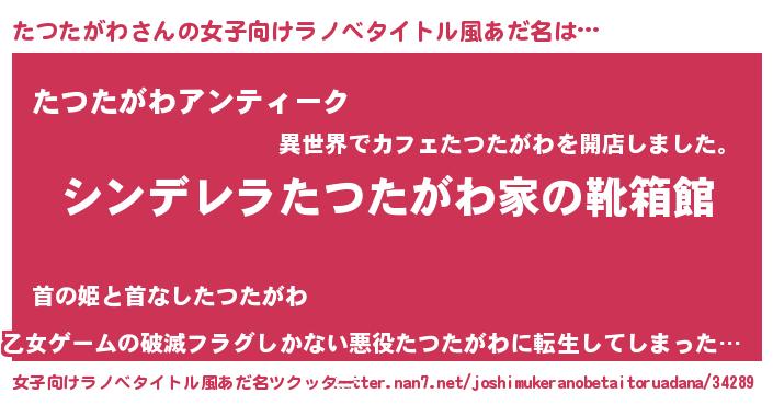 | 男性向けラノベタイトル風あだ名 | 『冴えないたつたがわの育てかた』 |