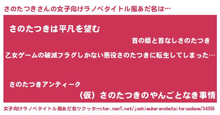 | 男性向けラノベタイトル風あだ名 | 『この素晴らしい世界にさのたつきを!』 |