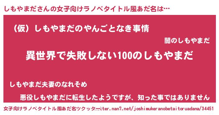 | 男性向けラノベタイトル風あだ名 | 『しもやまだという概念が存在しない退屈な世界 』 |