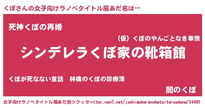 くぼさんの女子向けラノベタイトル風あだ名は… 『シンデレラくぼ家の靴箱館』『死神くぼの再婚』『闇のくぼ』 ツクッター #女子向けラノベタイトル風あだ名ツクッター http://tkutter.nan7.net/joshimukeranobetaitoruadana/34483/
