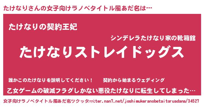 | 男性向けラノベタイトル風あだ名 | 『Re:たけなりから始める異世界生活』 |